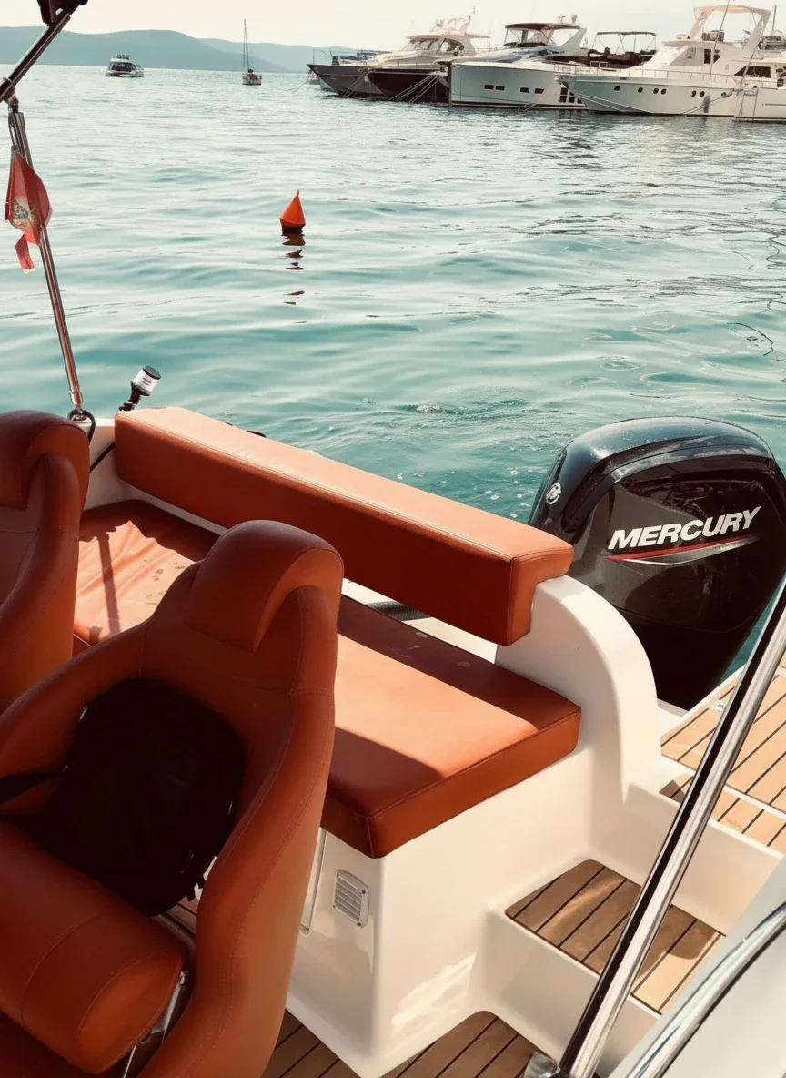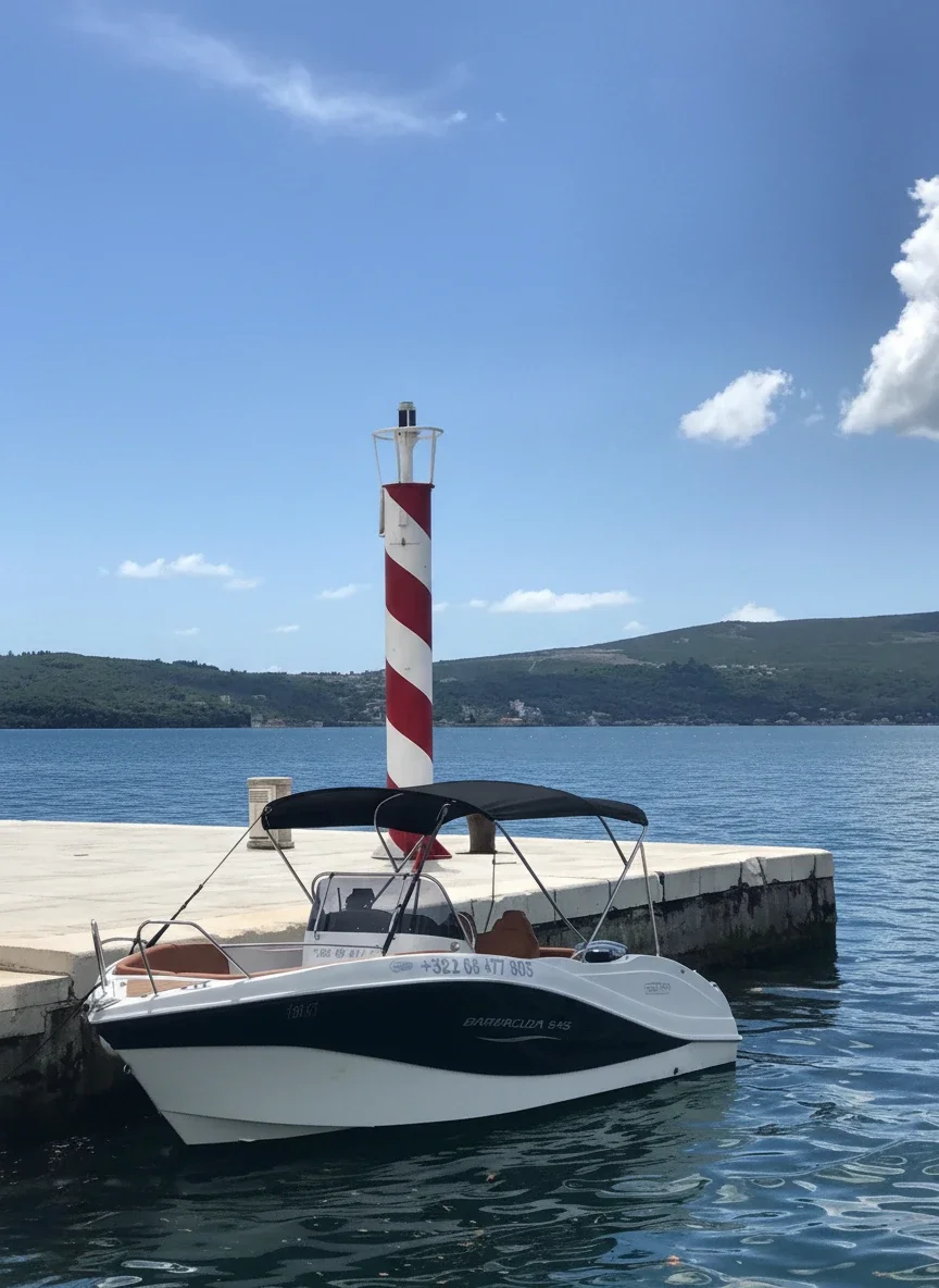 Barracuda 545 is a compact and versatile motorboat, perfect for comfortable day trips along the Adriatic coast. Equipped with a bimini top and additional sunshade tent, a refrigerator, freshwater shower, spacious sunbathing terrace, and swimming ladder, the boat provides everything needed for a relaxing and enjoyable time on the water. Thanks to her practical layout and easy handling, Barracuda 545 is one of the best options for exploring all the accessible locations of the breathtaking Bay of Kotor. From charming coastal towns and hidden beaches to panoramic viewpoints and crystal-clear swimming spots, this boat allows you to discover the very best of Boka Bay in comfort and style.