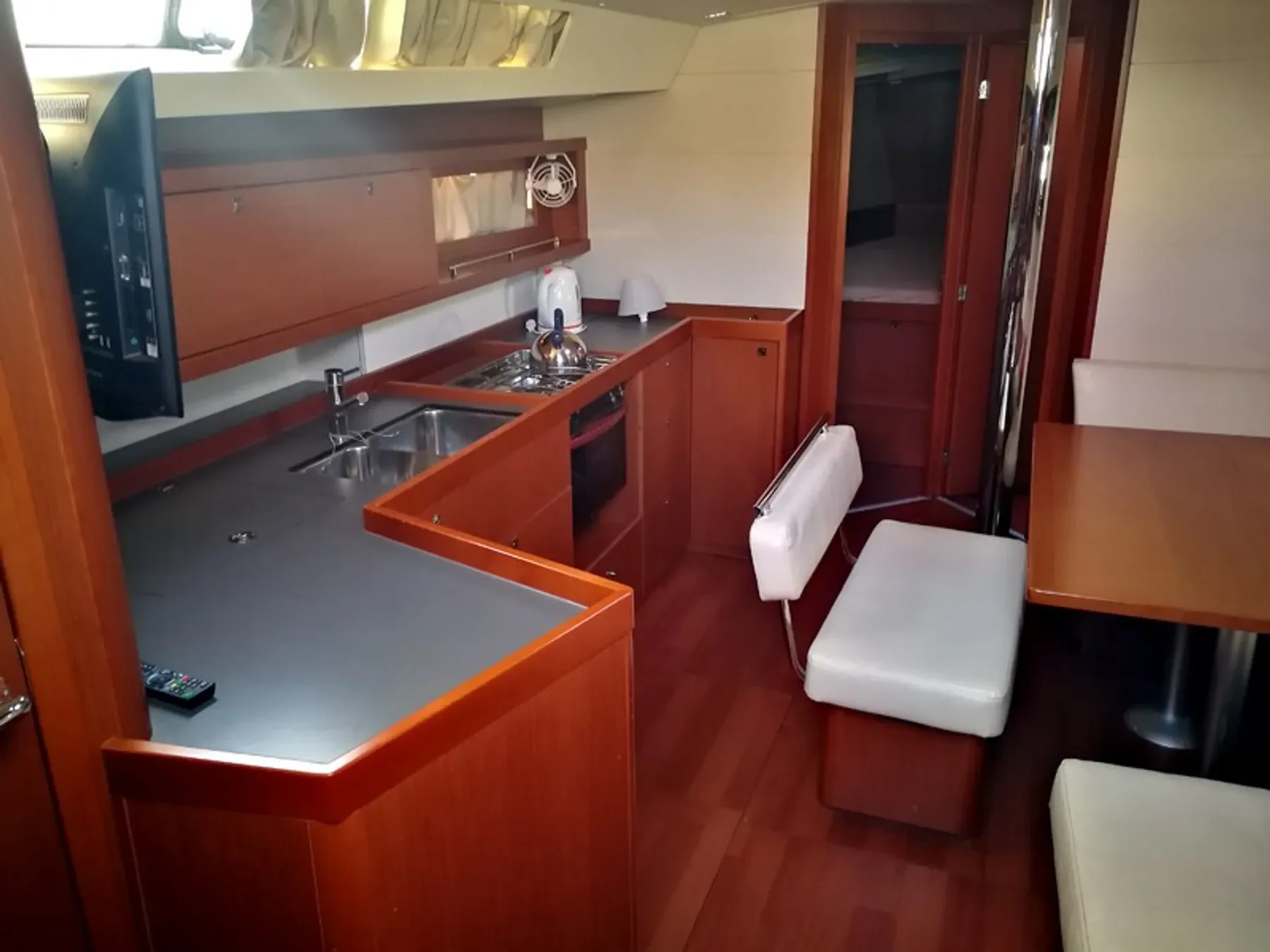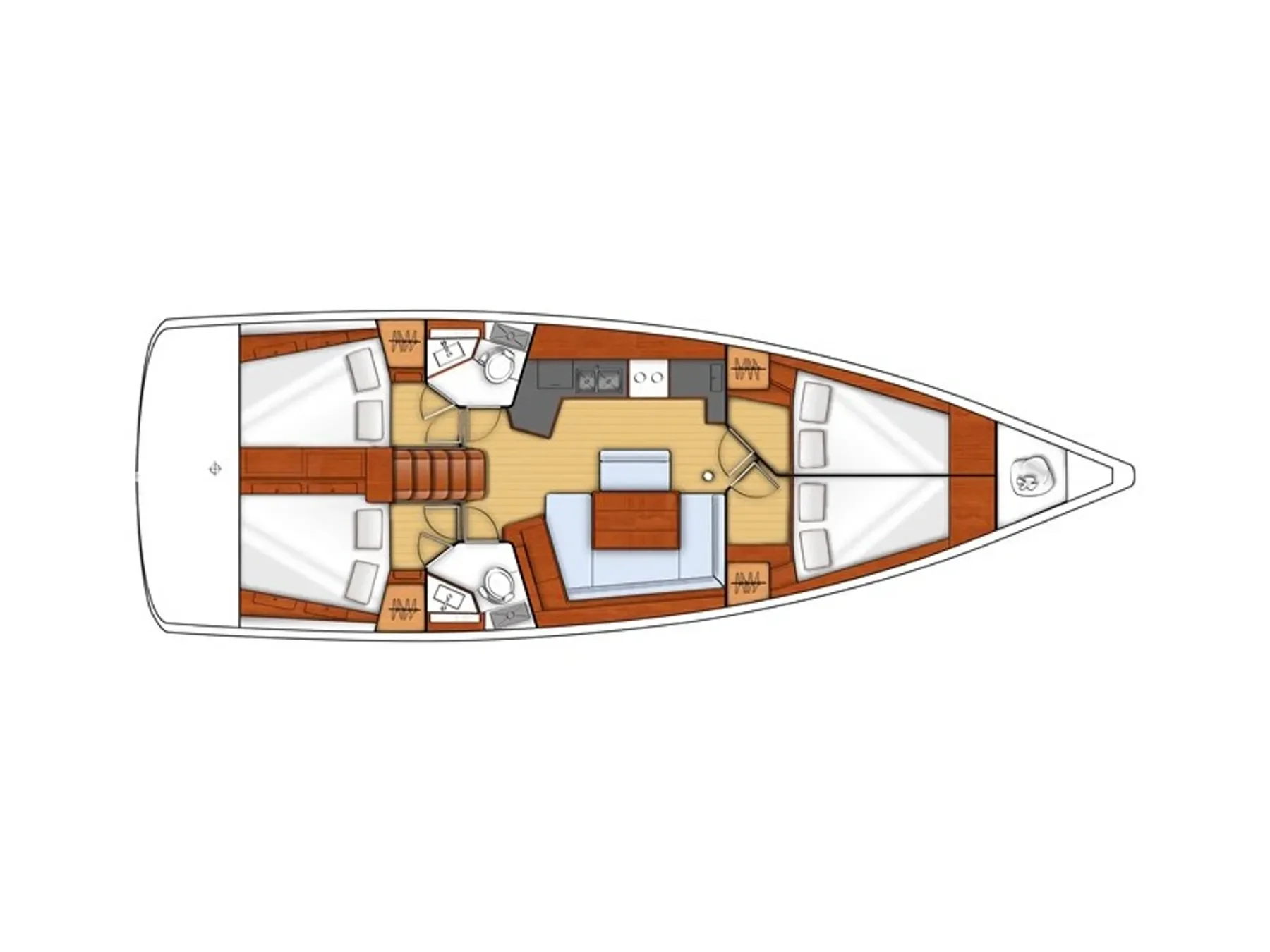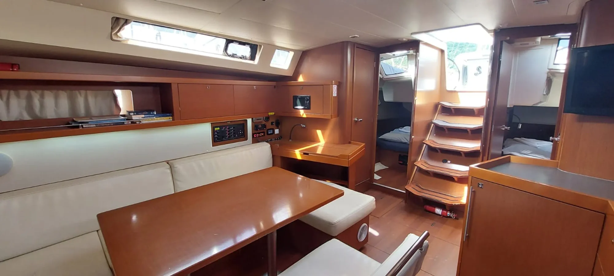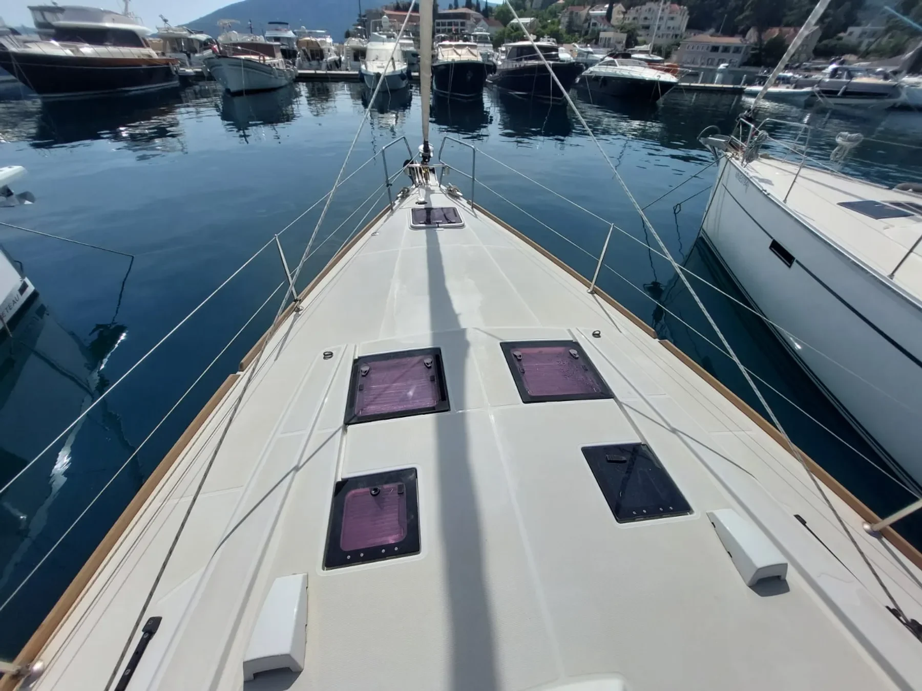 The Beneteau Oceanis 45 sailing yacht Stella, launched in 2014, is moored in Marina Lazure, Montenegro, and is well suited for comfortable coastal and offshore sailing. The yacht can host up to 9 guests, offering four double cabins along with a saloon that converts into an additional single berth. Pillows and blankets are included in the charter price for added comfort. On board, Stella is equipped with two bathrooms, each featuring a shower, ensuring convenience during longer voyages. The yacht’s equipment includes a rolling mainsail, a GPS plotter located in the saloon, a bow thruster for easy maneuvering, and a bimini providing shade in the cockpit. Additional amenities include air conditioning, heating, a flat-screen TV, and an audio system with exterior speakers. The fully equipped galley features a refrigerator, oven, stove, sink, and complete kitchen utensils, allowing for comfortable meal preparation throughout your sailing trip.