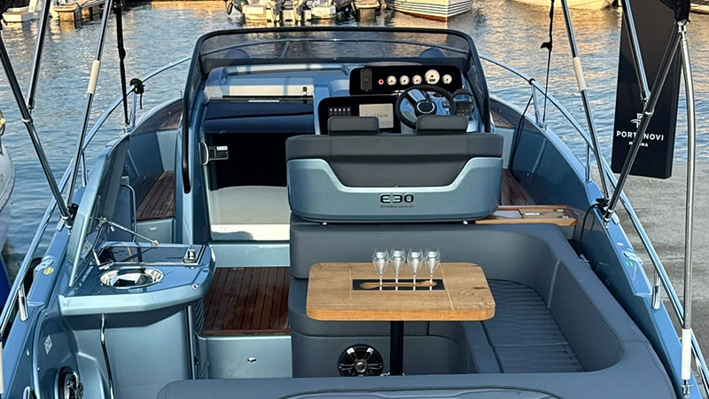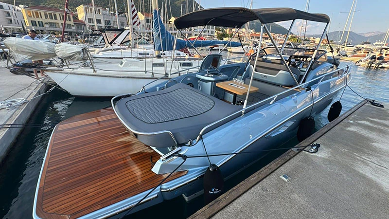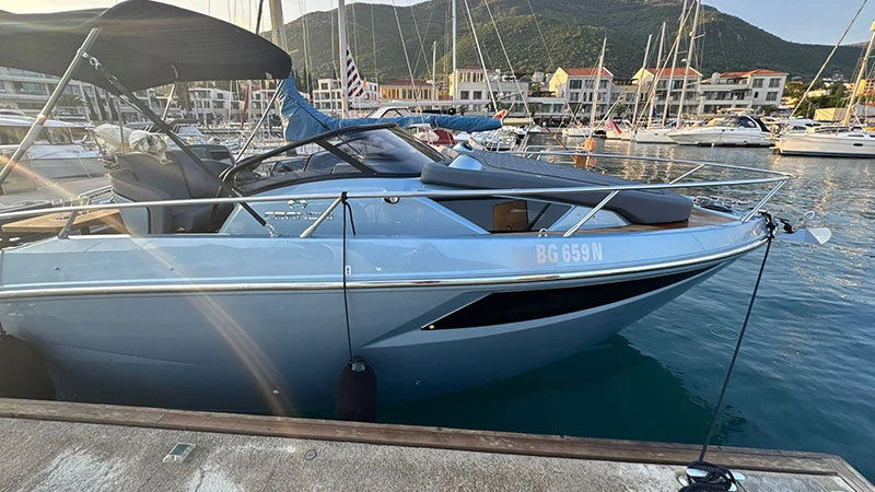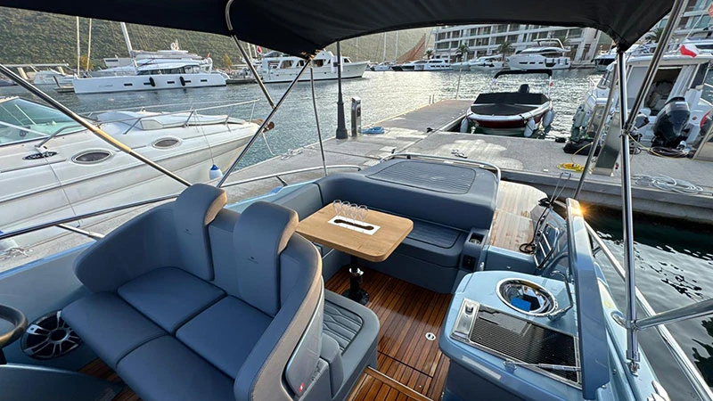 The Cranchi E30 is an elegant and versatile motor yacht, ideal for day trips and short cruises along the beautiful Bay of Kotor. Designed with a strong focus on comfort and functionality, this yacht offers a spacious cockpit and a comfortable cabin, creating a perfect setting for relaxing time on the water. Featuring modern Italian design with clean lines and a sporty profile, the Cranchi E30 delivers excellent performance and smooth handling. Powered by reliable engines from Volvo Penta, the yacht ensures stable cruising and easy maneuverability. The large cockpit provides generous seating space, a sunbathing area at the stern, and a dinette table that can be folded when needed. A practical wet bar with sink and refrigerator makes the boat well suited for entertaining and enjoying refreshments during your cruise. Below deck, the yacht features a comfortable cabin with sleeping space for two guests, a small lounge area, a compact galley, and a separate bathroom with a shower. Large windows and deck hatches allow plenty of natural light into the interior, creating a bright and welcoming atmosphere. Built with high-quality materials and refined craftsmanship, the Cranchi E30 combines style, performance, and practicality, making it a great choice for couples or small groups looking to explore the Adriatic coast in comfort.